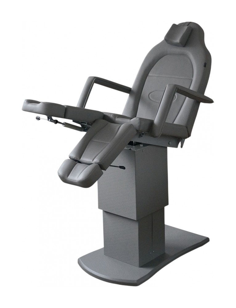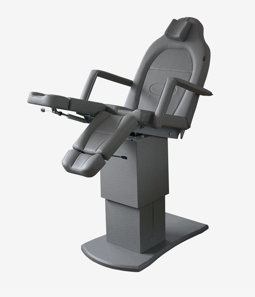Педикюрное кресло оснащено двумя электромоторами, обеспечивающими регулировку высоты и угла наклона сиденья. Опоры для ног фиксируются при помощи газ-лифтов. Кресло легко раскладывается в горизонтальное положение, образуя ровную поверхность. Надежная конструкция системы подъема обеспечивает высокую устойчивость кресла даже при максимальной высоте. Управляется при помощи ручного проводного пульта.