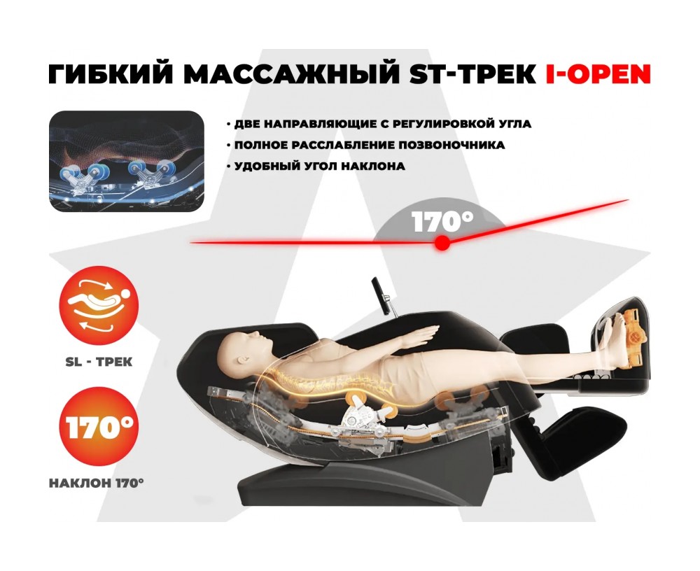 • Передовой гибкий SL- трек I-OPEN 170 градусов эффективно обеспечивают полное расслабление позвоночника