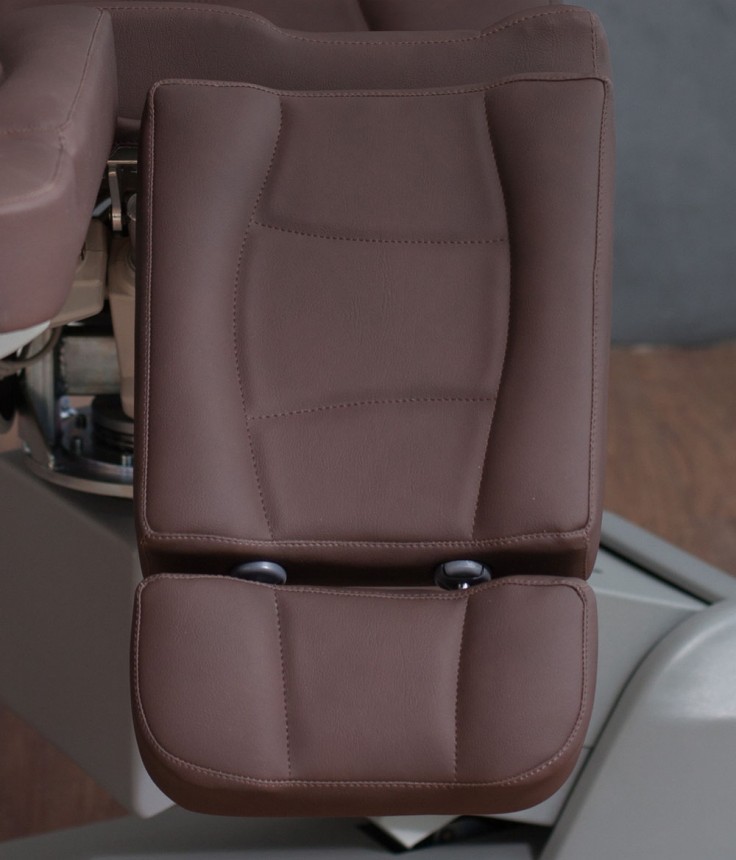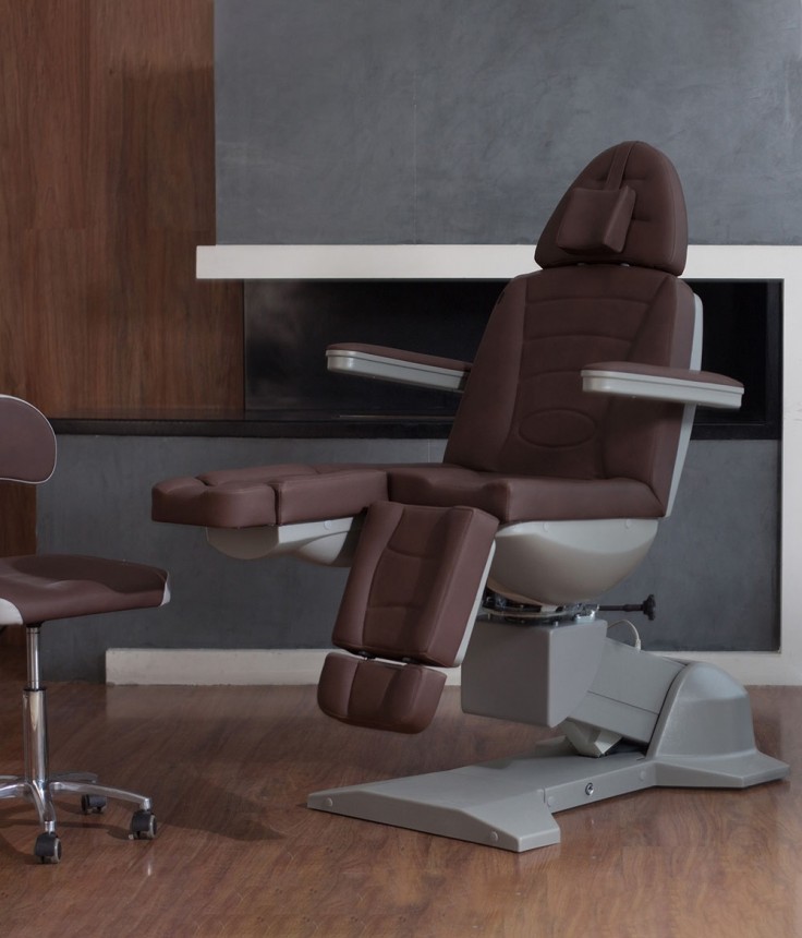Педикюрное кресло оснащено тремя электромоторами, обеспечивающими регулировку высоты, угла наклона спинки и угла наклона сиденья. Опоры для ног фиксируются при помощи газ-лифтов. Кресло легко раскладывается в горизонтальное положение, образуя ровную поверхность. Надежная конструкция системы подъема обеспечивает высокую устойчивость кресла даже при максимальной высоте. Откидывающиеся подлокотники делают более удобным процесс посадки клиента. Управляется при помощи ручного проводного пульта. Дополнительно при производстве могут быть установлены различные опции.
